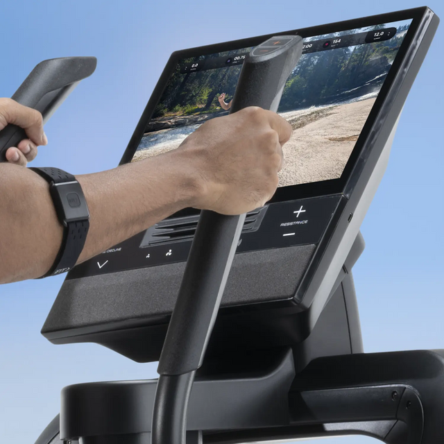 One machine for every style of training. Step, glide, and run. Tilt the screen to follow strength or yoga off the equipment too.